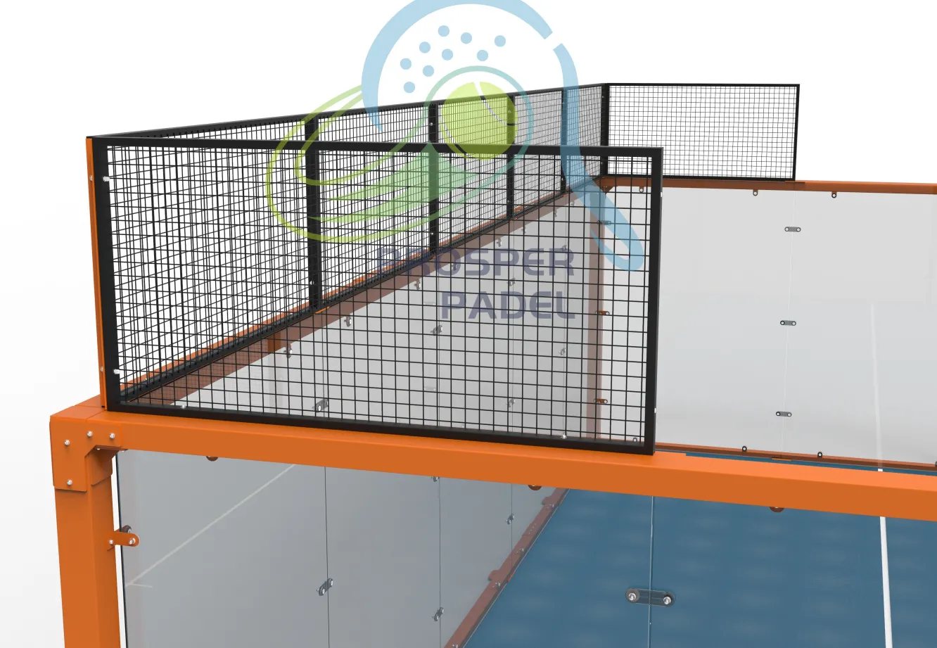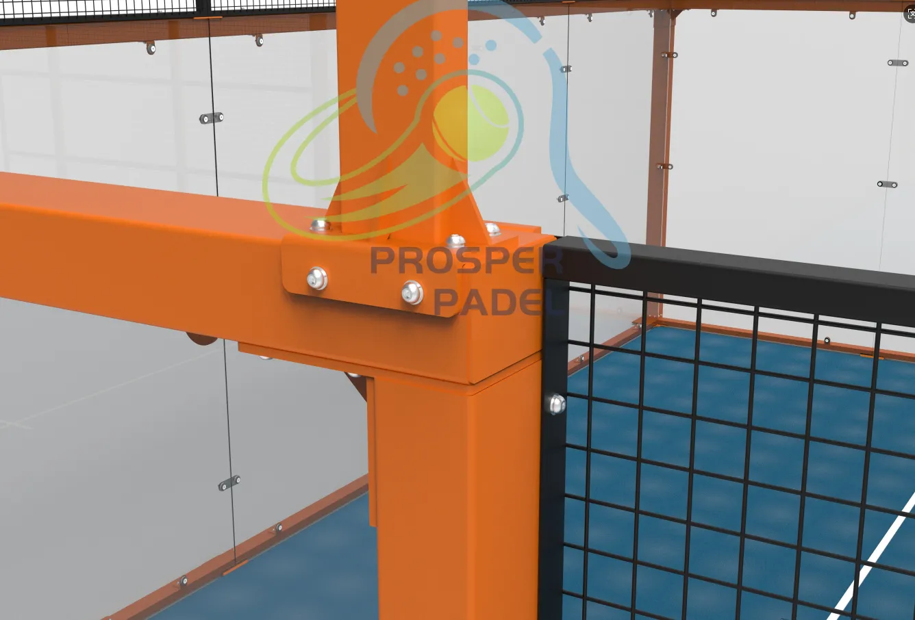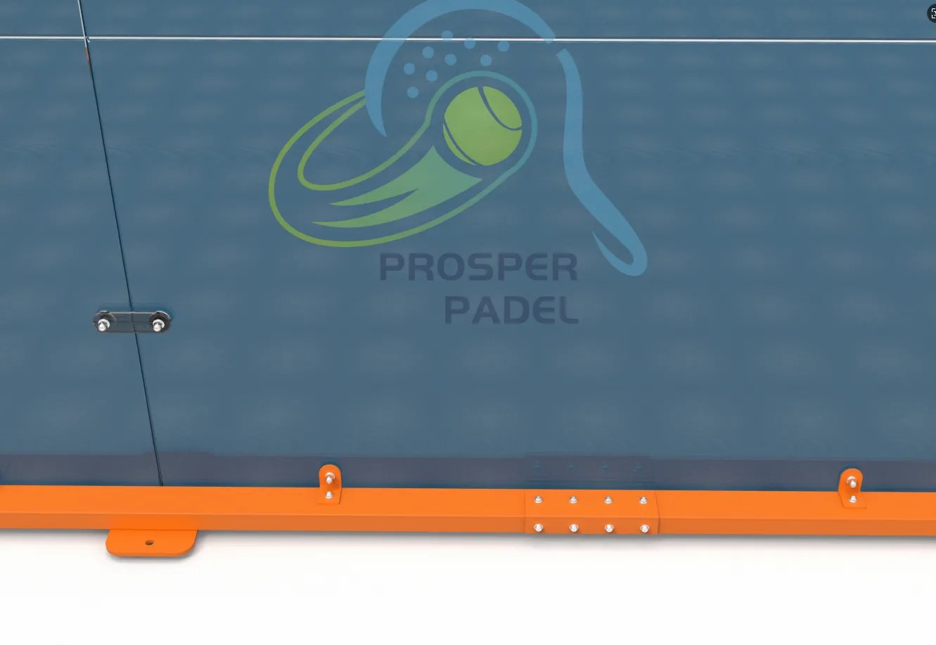 El panorámico Padel Palacio de Justicia presenta una llamativa paleta de colores y un diseño estructural bien organizado como sus principales puntos fuertes. Concretamente, el bastidor está construido con tubos de acero galvanizado de 100×100×3 mm, un material que combina estabilidad y resistencia a la corrosión. Como estructura central de soporte del marco, garantiza la planitud vertical del sistema (incluyendo paredes de vidrio templado y malla metálica) y la estabilidad del rebote de la pelota. La superficie del marco está tratada con recubrimientos blancos, negros y naranjas, lo que da lugar a colores uniformes y ricos que crean una identidad visual fuerte y contrastan fuertemente con otras zonas del campo, cumpliendo con los requisitos de diferenciación de color para los recintos de competición. La capa superficial está cubierta con césped artificial azul, con fibras densas de césped y elasticidad moderada, satisfaciendo las necesidades de antideslizante, absorción de impactos y rebote del balón durante las actividades deportivas.